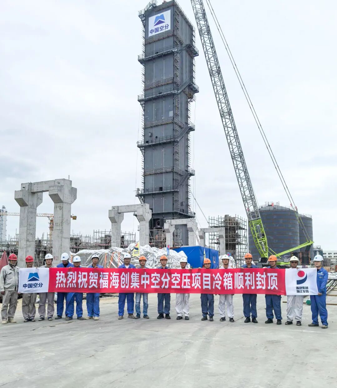 日前,福海創(chuàng)集中空分空壓項目空分裝置冷箱順利完成封頂作業(yè),這座高達67米的核心設備巍然成型。
